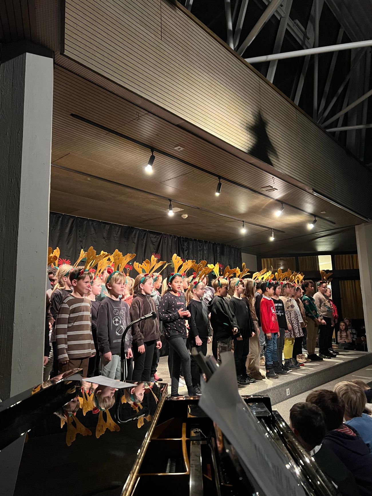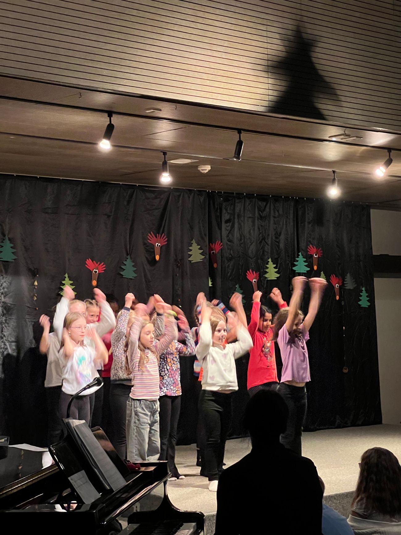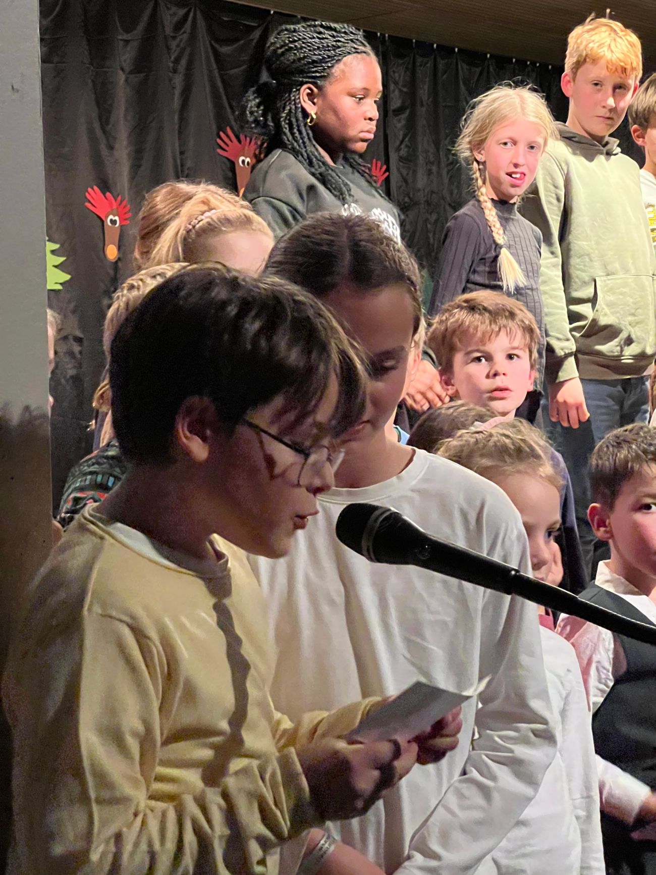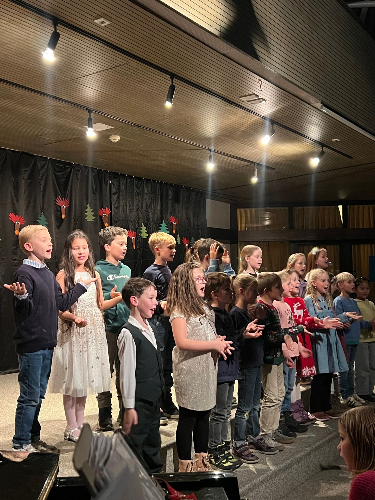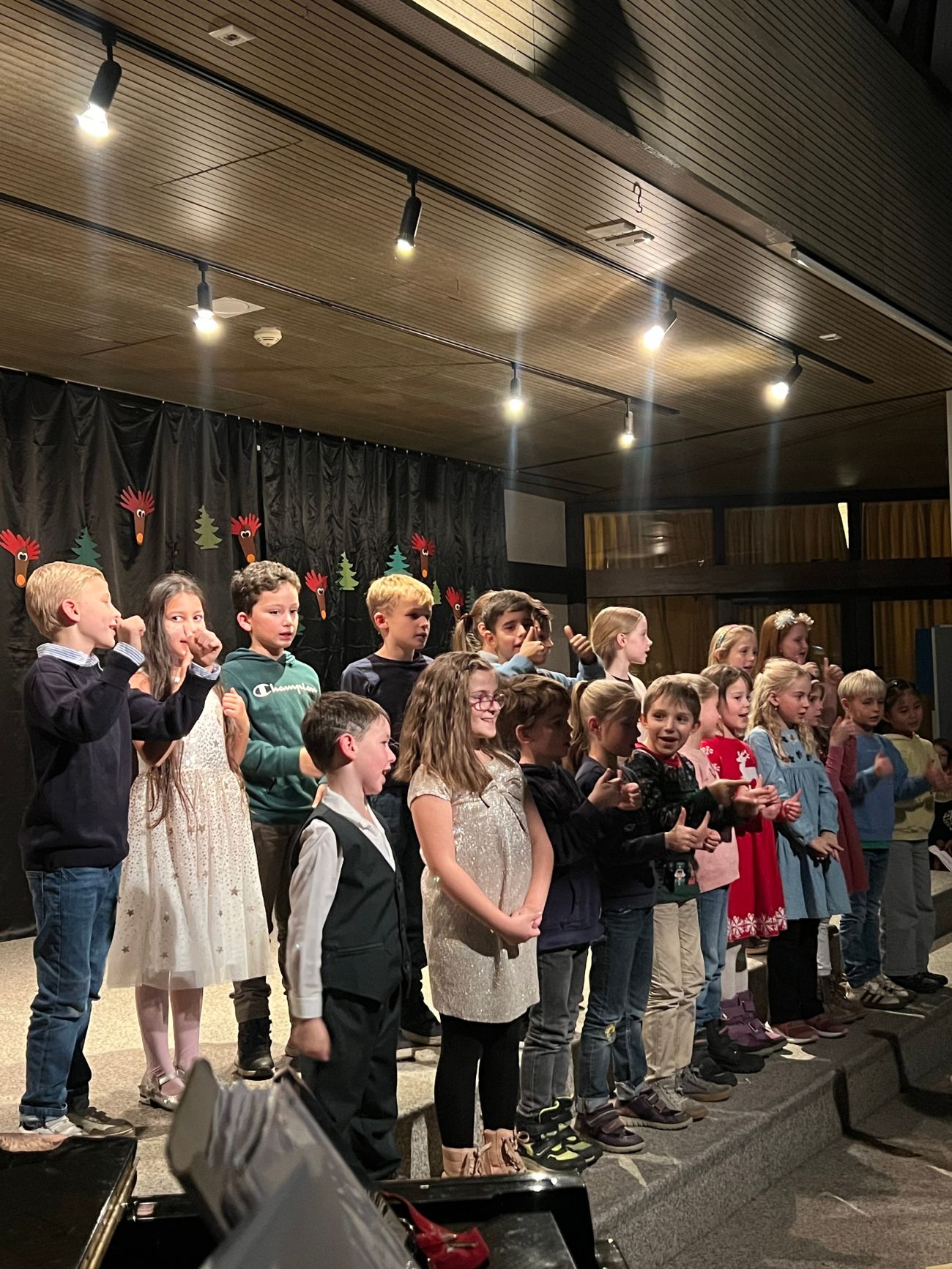 Als vierter Programmpunkt betraten die Klassen 3a und 3b die Bühne. Unter der Leitung ihrer Klassenlehrerinnen Frau Kohm und Frau Teutsch trugen sie zunächst ein weihnachtliches Gedicht vor. Anschließend sangen die Kinder mit spürbarer Freude ein Lied, in dem „Rudolf mit der roten Nase“ die Hauptrolle spielte – ein echter Publikumsliebling.