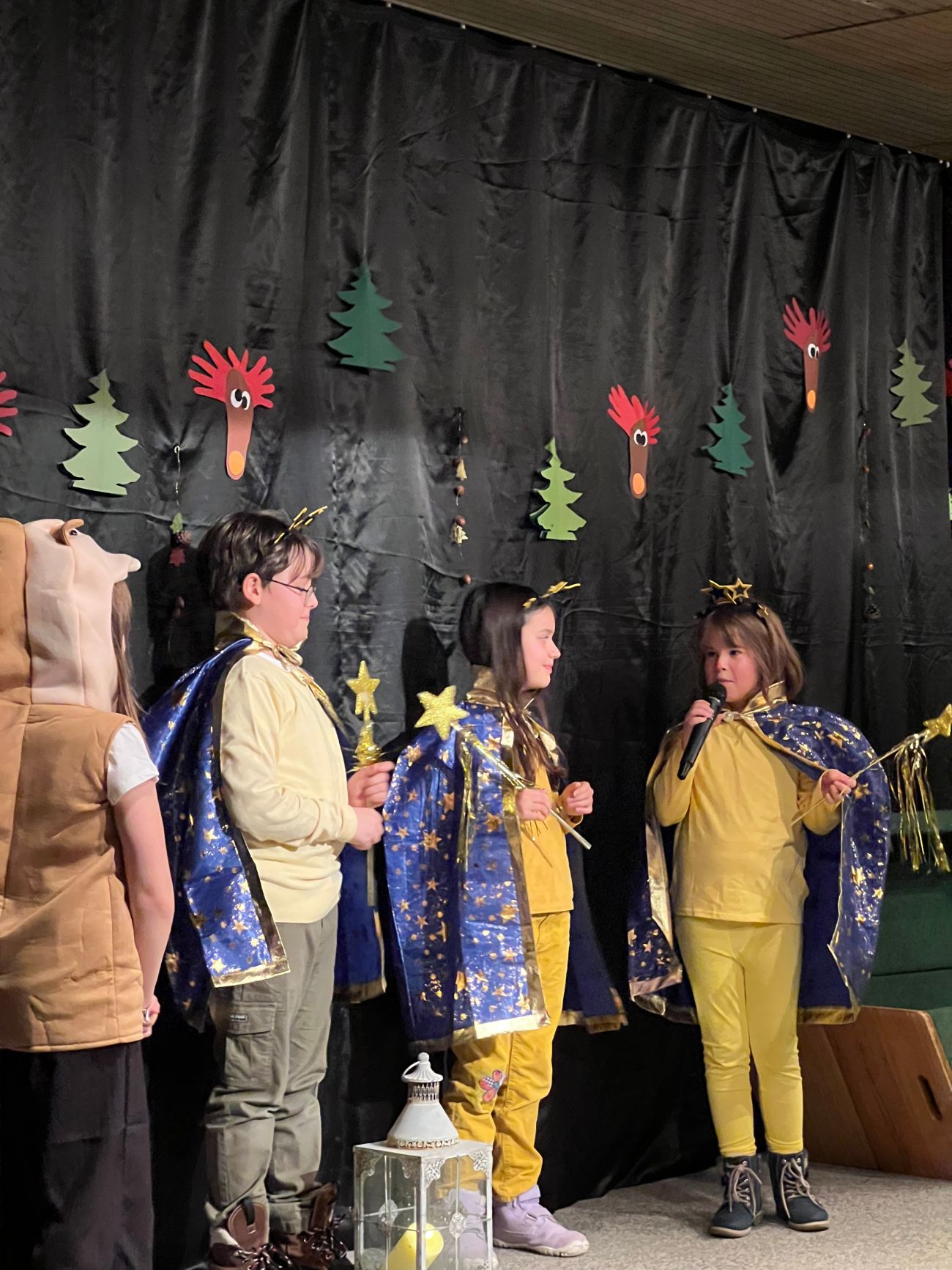 Danach wurde es schauspielerisch: Die Theater-AG unter der Leitung von Herrn Hörmann brachte das Stück „Abenteuer im Weihnachtswald“ auf die Bühne. Mit viel Spielfreude, lebendigen Dialogen und passenden Kostümen nahmen die Kinder das Publikum mit auf eine kleine Reise voller Überraschungen.