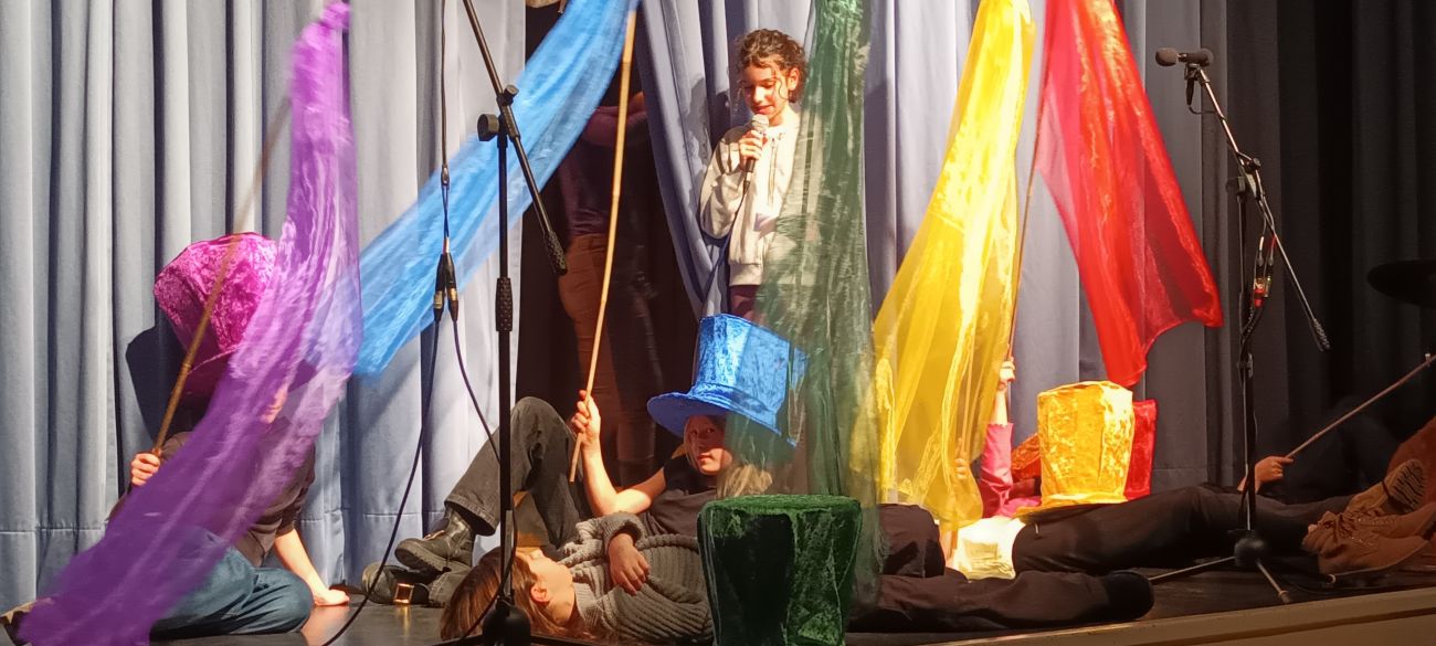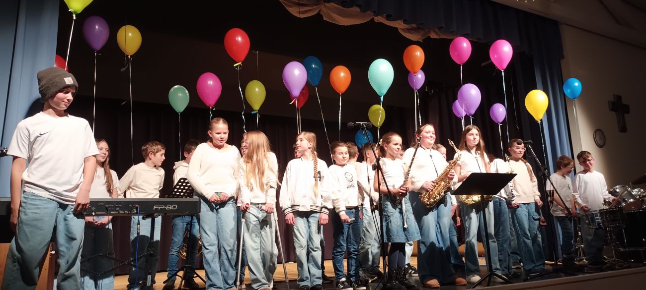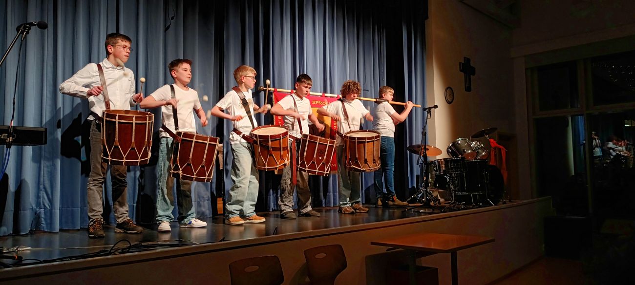 Eine Antwort auf diese Frage gaben zum Ende des ersten Schulhalbjahres an die 250 Mitwirkende aus allen weiterführenden Schularten des BSBZs. Am „Bunten Abend 2026“ spielten, sangen, turnten und musizierten die Kinder und Jugendlichen über zwei Stunden vor einer vollen „Neuen Aula“. Ein Gemisch aus Aufregung und Vorfreude erfüllte den Raum. Schulklassen waren zum Teil in voller Stärke mit Ihren Lehrkräften angetreten um Eltern, Freunden und Gästen endlich das zeigen zu können, was sie in den letzten Wochen eingeübt hatten. Eingeführt vom rosa gekleideten Zeremonienmeister Jörg Seethaler startete das Moderatorenteam aus der Theater-Freizeitgruppe in den Abend. Behütet mit überdimensionalen farbigen Zylindern, Fähnchen in allen Farben schwenkend, war allen ziemlich schnell klar: Der Abend wird bunt, knallbunt. Als Erste hauten die Vaganten mit ihren Trommeln so richtig auf die Pauke und zwar so, dass die Wände vibrierten. Danach ließ die RS5a 99 Luftballons steigen, ein toll gesungener und musikalisch glänzend begleiteter Song, heute aktueller denn je. Die 5er aus der WRS besangen danach Rom, die Stadt auf 7 Hügeln: Romans on the dancefloor.