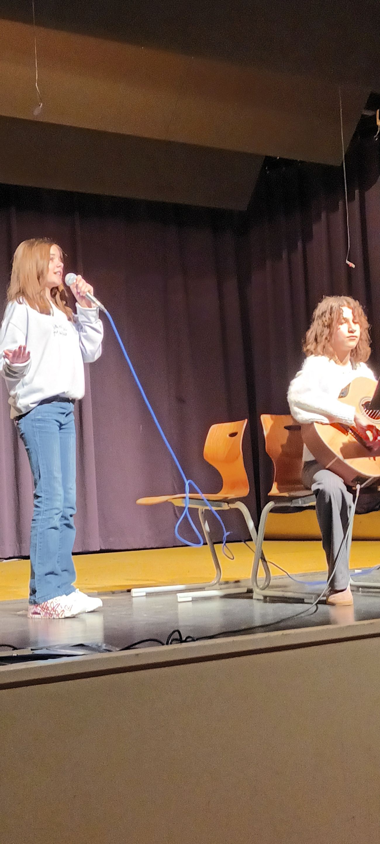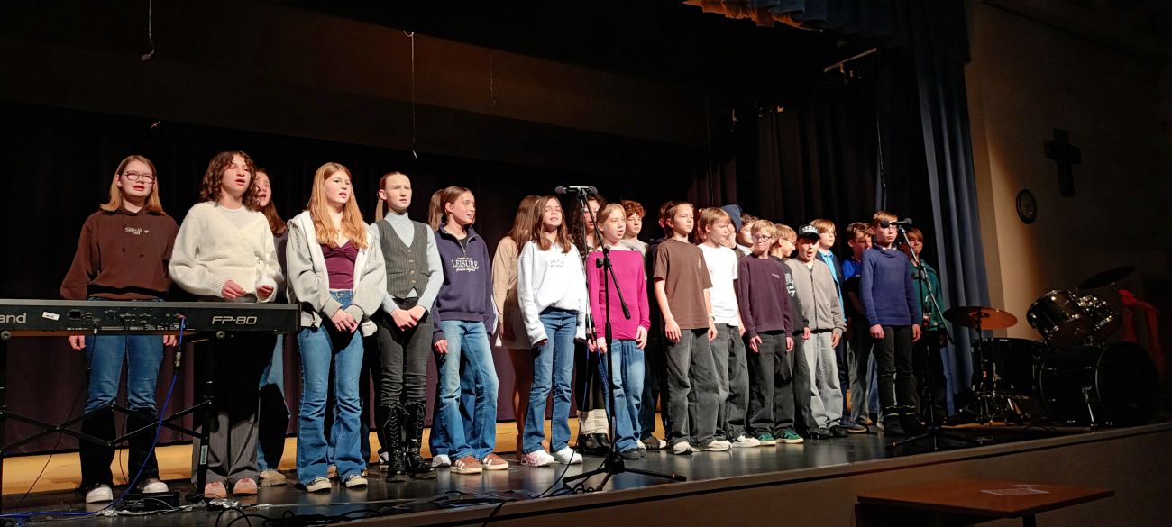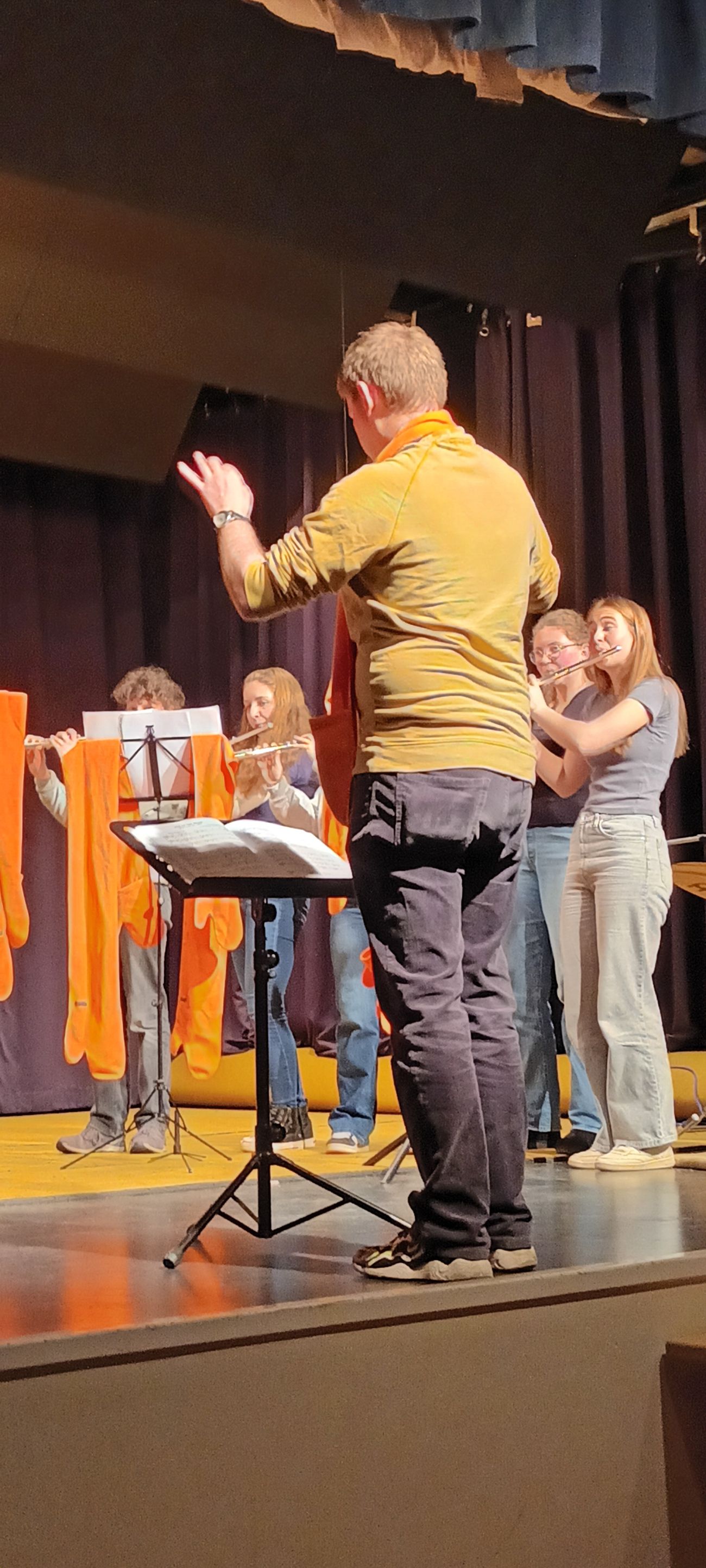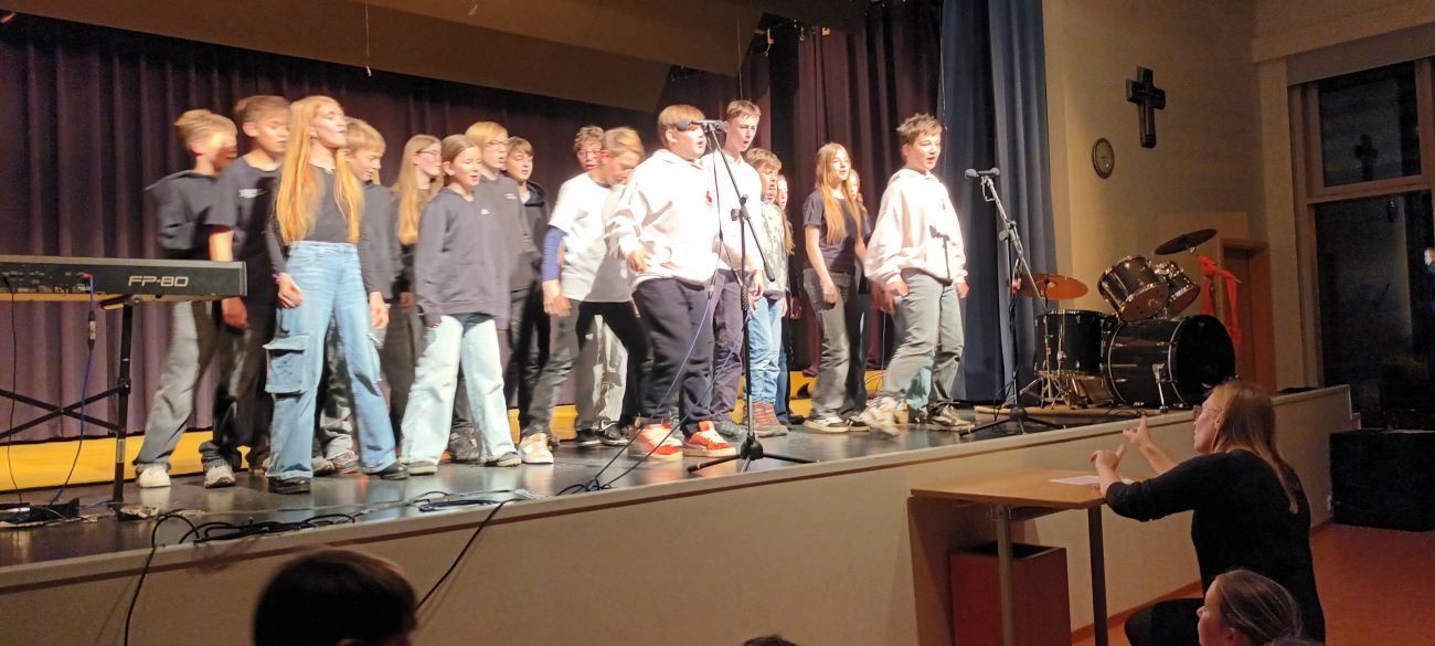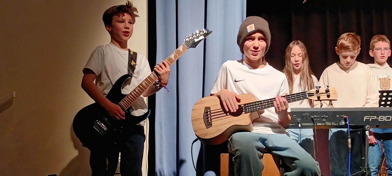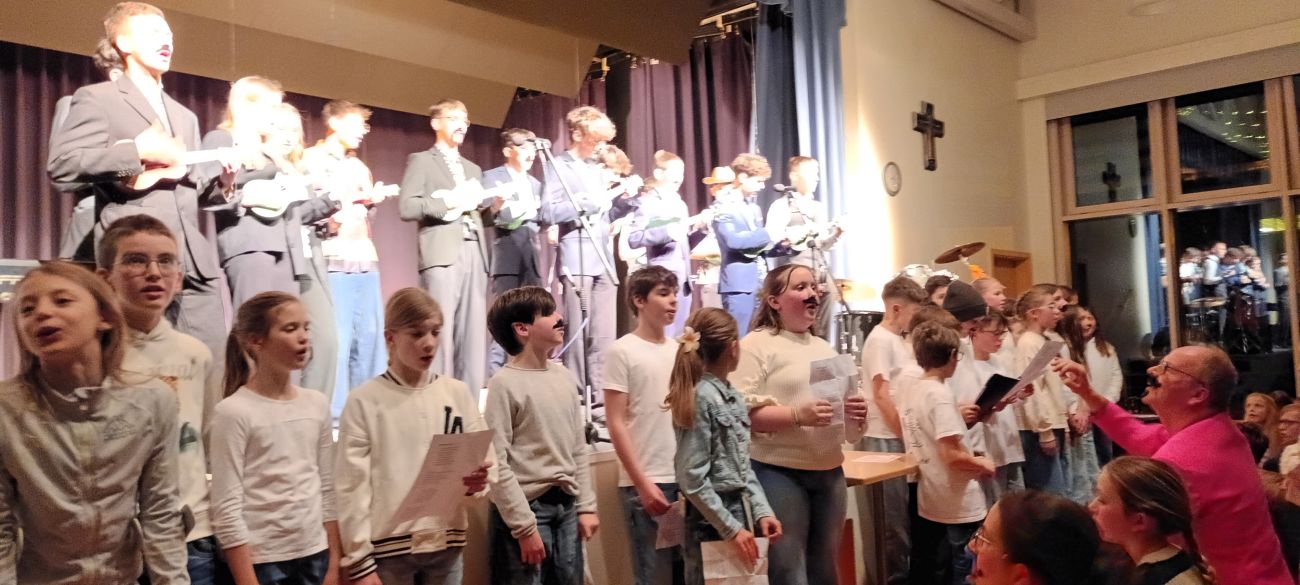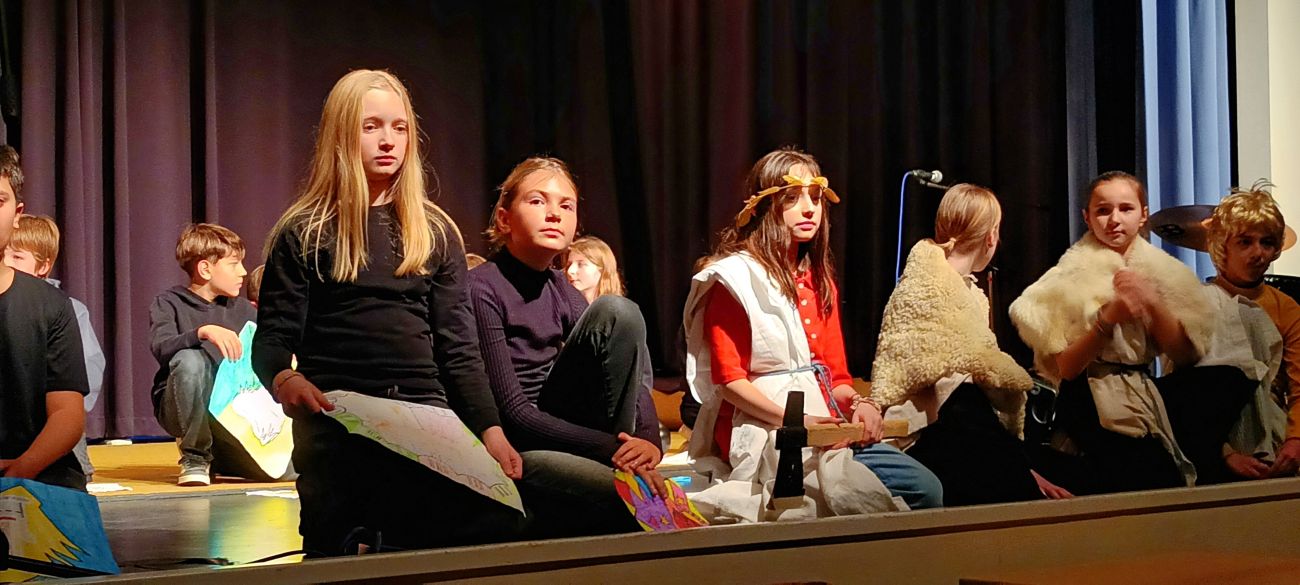 Nach kurzem Umbau entzückten die Mädchen der RS6a durch Tanzakrobatik, bevor ihre Klassenkameraden Tim und Neo das Publikum mit gewagten Reifensprüngen in Atem hielten. Richtig Stimmung im Saal herrschte beim Barbie Song und dem Lied „Wo ist meine Mama, wer hat sie gesehen“. Beide Musikstücke gestalteten die 6. Klassen der WRS mit ihren Boomwhackers gekonnt und mit hoher Konzentration. Mit verblüffenden Effekten verzauberten im Anschluss die 6. Klassen des Gymnasiums das Publikum. Inspiration für ihr Schattentheater „Der Nussknacker“ hatten sich die Schüler in den vorangegangenen Wochen im Ballett in Stuttgart geholt. Gleich danach behauptete ein Chor der RS6b in einem bekannten Song, dass die Löwen heute Nacht schlafen würden. Mucksmäuschenstill war es im Saal, als Leonie und Rebecca ihren Auftritt hatten. Begleitet von einer Gitarre bat die Sängerin in ihrem Lied alle, auf ihr Bauchgefühl zu achten. Dass Teile des Programms im Advent entstanden, zeigte das groovige Jingle Bells der RS5a, begleitet von einigen Achtklässlern. Musikalisch mit hoher Geschwindigkeit gings auch gleich weiter und zwar mit dem Bischi Abbrunzati Boys und Girls-Hit: Velocita. Die gymnasiale Oberstufe, alle an diesem Abend beim Theaterbesuch in der Stadthalle Biberach, schickte per Video ihren Song Barbar‘ Ann, einen Beach Boys Klassiker, in den Saal. Um Zusammenhalt ging es im Lied „Stand by me“, den die RS7b ausdrucksstark in einer stimmigen Choreographie umsetzte. Herzerwärmend und am Flügel begleitet intonierte die 7b des Gymnasiums den Titelsong „Vois sur ton chemin“ aus dem französischen Film „Die Kinder des Monsieur Mathieu“.