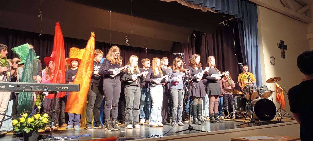 Als vorletzter Programmpunkt schaute die BBC – "Bischi-Bläser-Combo“- dem Tiger ins Auge, Rocky lässt grüßen. Probier‘s mal mit Gemütlichkeit versetzte im Anschluss das Auditorium in Balu-like Schwingungen. Am Ende glänzte die 7a des Gymnasiums mit Saphire und Body Rock. Nach über 2 Stunden abwechslungsreichem Programm bedankte sich die Schulleitung bei den Mitwirkenden aus 17 Klassen, bei 16 Kolleginnen und Kollegen und, nicht zu vergessen – beim Schüler Technik Team für einen fulminanten, knallbunten Abend. Unterstützt von den Ukulelen der RS9b endete diese bemerkenswerte Performance mit dem Coldplay-Song „Viva la vida“- Es lebe das Leben!