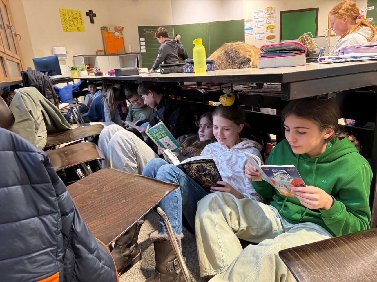 Am Bischof Sproll Bildungszentrum findet wöchentlich eine gemeinsame Lesestunde statt, an der Schülerinnen und Schüler der Grundschule, der Werkrealschule und der Realschule gleichzeitig teilnehmen. Während dieser Zeit wird gelesen – ganz in Ruhe und ohne Unterrichtsstress. Die Kinder und Jugendlichen dürfen es sich dafür im Klassenzimmer, in der Turnhalle oder in den Sommermonaten auch im Freien gemütlich machen.