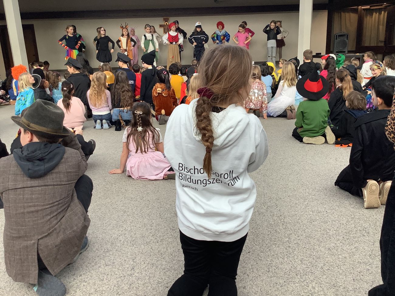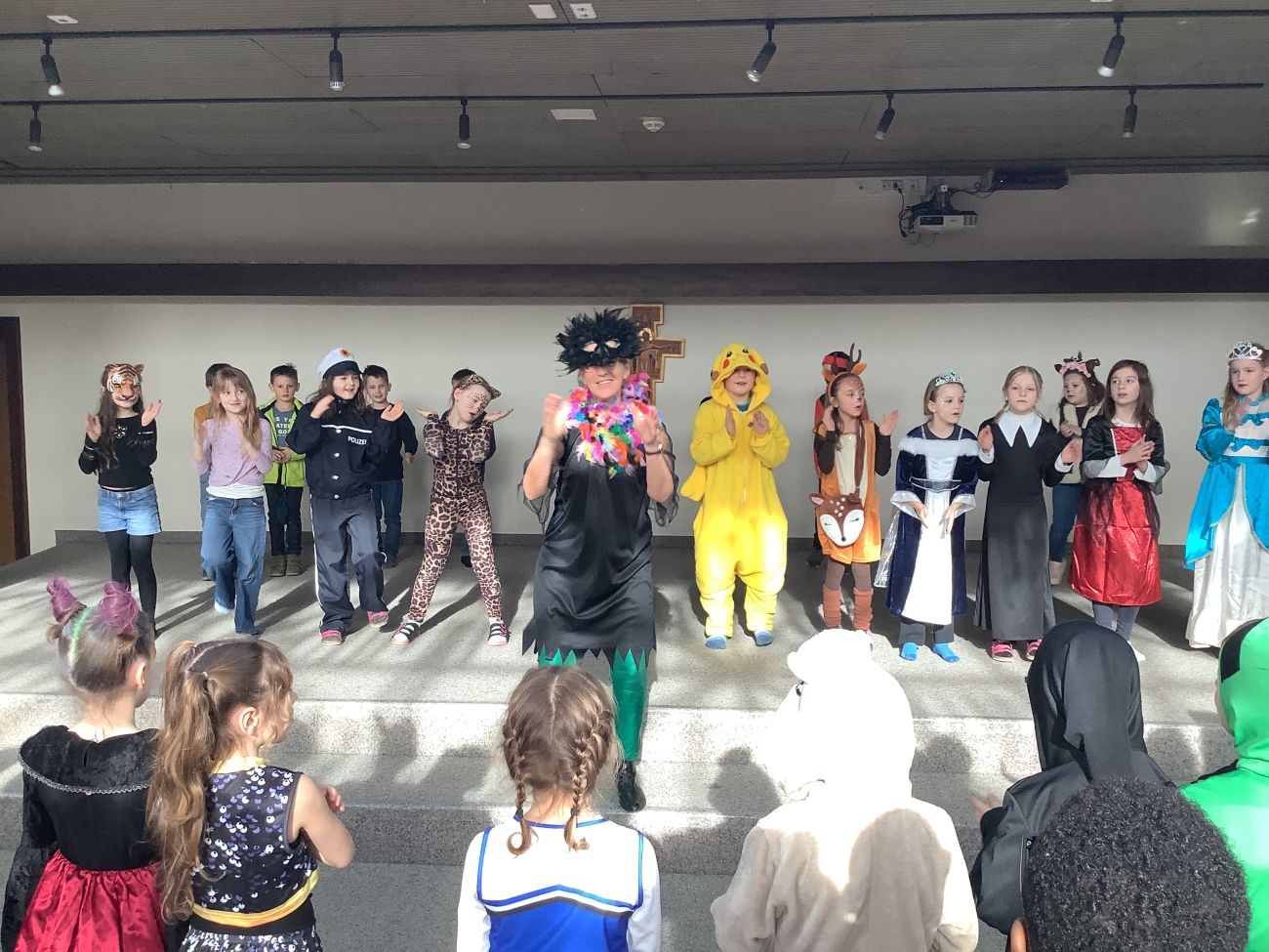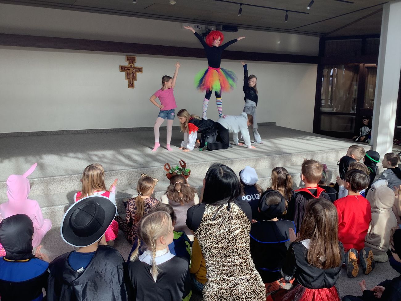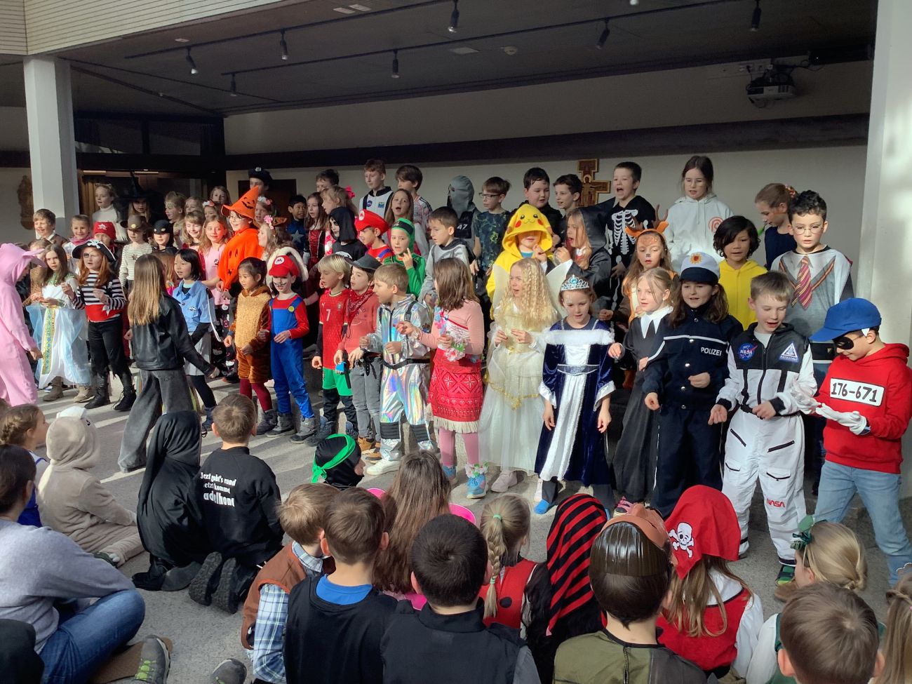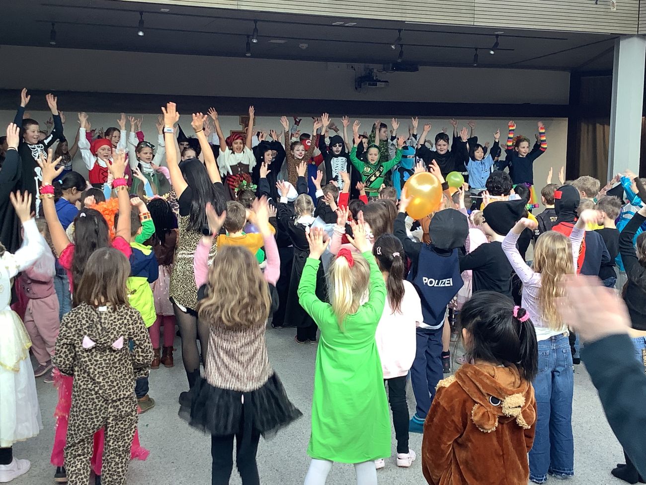 Traditionell wurden alle Grundschulklassen + die Kooperationsklasse 1 SBBZ Baindt Sehen nach der großen Pause mit einer Polonaise abgeholt. Mit fetzigen Liedern wurden sie in die alte Aula geführt. Singen, Tanzen, Akrobatik, Witze, Fasnetssprüche, Lachen, dort gab es einiges zum Bestaunen und Mitmachen. Bunt und vielfältig war das Programm, so dass die Zeit viel zu schnell verrann. Wir freuen uns schon auf´s nächste Jahr und singen laut: Hipp, Hipp, Hurra