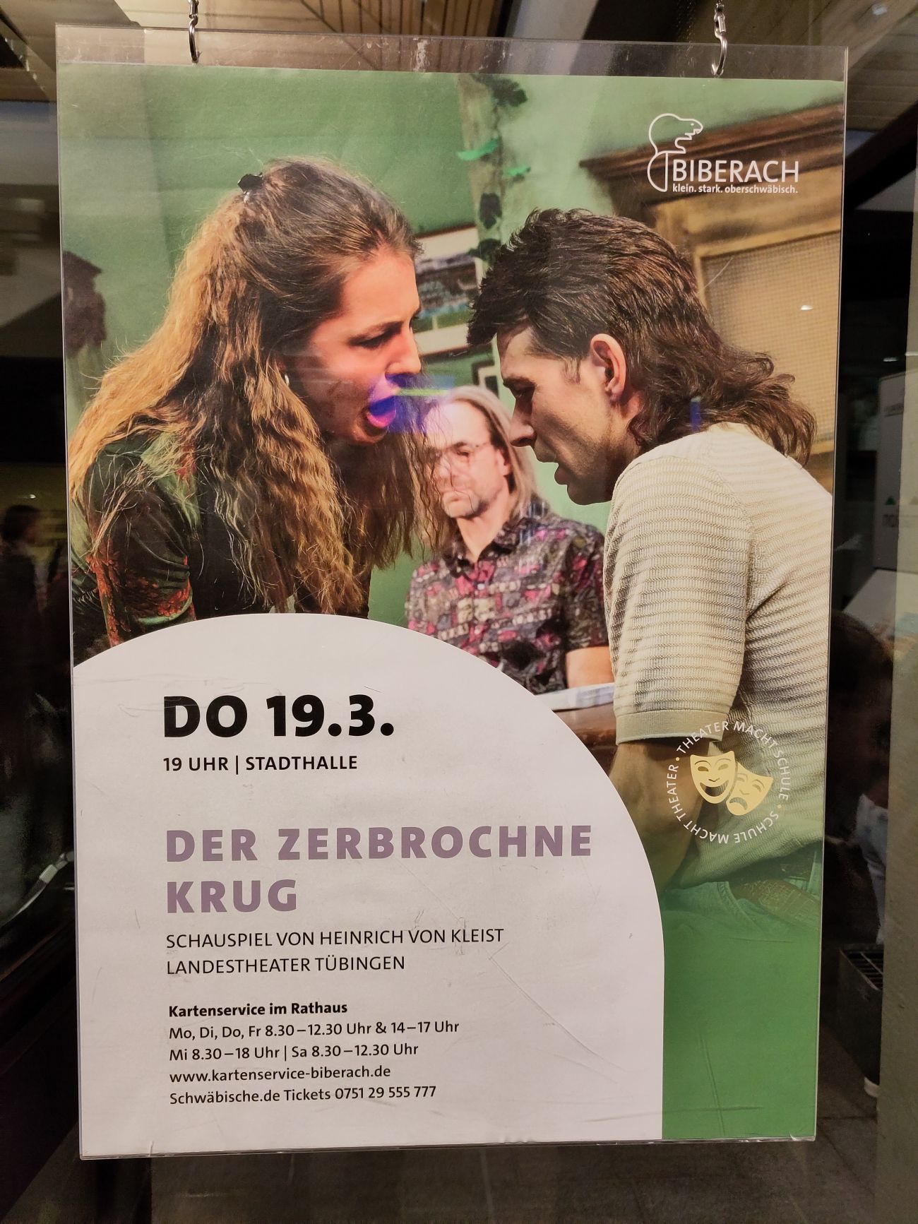 Irgendwo zwischen Sportheim, Vereinsfeier, Gerichtssaal und Peter Steiners Theaterstadel befindet sich die Inszenierung Heinrich von Kleists "Der zerbrochne Krug" vom Landestheater Tübingen. Der Deutsch-Leistungskurs der J2 erlebte ebendies am 19.03.26 in der Stadthalle selbst mit und verfügt nun über eine völlig neue Perspektive auf das Werk. Das im Jahr 1808 uraufgeführte Lustspiel handelt von dem korrupten Dorfrichter Adam, der im niederländischen Huisum unter Beobachtung des Gerichtsrates Walter über einen zerbrochenen Krug urteilen muss, den er selbst bei einem nächtlichen, versuchten sexuellen Übergriff auf die junge Eve in deren Zimmer zerstört hat. Anstatt einer erwartet klassisch nach Stil des 17. Jahrhunderts hergerichteten Kulisse fanden die Schüler ein Bühnenbild vor, bei dem es sich um einen Multifunktionsraum voller stereotypischer Requisiten, darunter eine Kuckucksuhr, handelte. Bedient wurden jegliche Klischees des Dorflebens, während gleichzeitig eine vertraute Atmosphäre herrschte. Dennoch verblieb der Text überraschend originaltreu, sodass komische Elemente nahezu ausschließlich durch das Schauspiel selbst zur Geltung kamen. Selbst groteske Situationen, wie den Sturz Adams und Ruprechts aus dem Fenster, wurden pointiert dargestellt, jedoch kippte die Vorstellung nie in eine reine Komödie. Stattdessen wurde gezielt Gesellschaftskritik geübt, beispielsweise durch die weiblich besetzte Rolle des Gerichtsrat Walters, die vorerst mit ihrem souveränen Auftreten hervorstach. Diese erreichte allerdings nur aufgrund einer schleichenden Abkehr von den Formalitäten und den Wechsel ins Informelle im Rahmen einer „Vesperpause“ die Offenlegung des Tathergangs. Nachdem der Wahrheit auf den Grund gegangen worden war, verließ Walter als Erstes die Bühne, gefolgt von allen anderen - bis auf den Richter Adam. Dass dieser schlussendlich allein zurückblieb, war kein Zufall, sondern vielmehr eine klare Botschaft: Die sündhaften Strukturen bestehen fort - der Täter gewinnt. Das Opfer Eve hingegen steht selbst nach vermeintlicher Klärung des Falls alleine da. Insgesamt war es ein Abend, der stellenweise durchaus zum Lachen reizte, dessen Humor aber zunehmend im Hals stecken blieb. Gerade im Hinblick auf das bevorstehende Abitur half die Inszenierung, zentrale Inhalte des Dramas zu vergegenwärtigen und eigene Interpretationsansätze zu entwickeln.
