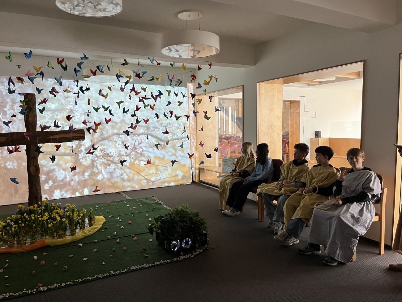 In individuell gestalteten Räumen, begleitet von passender Musik, erlebten wir die einzelnen Stationen der Geschichte auf ganz neue Weise. Besonders eindrucksvoll war das Nachspielen des Palmsonntags: Einige durften sogar auf einem „Esel“ sitzen, während andere die jubelnde oder auch kritische Menge darstellten. Denn nicht alle waren begeistert – manche wurden wütend. Vor allem die „High Society“ sah in Jesu Botschaft eine Gefahr, denn viele lebten vom Tempelbetrieb.