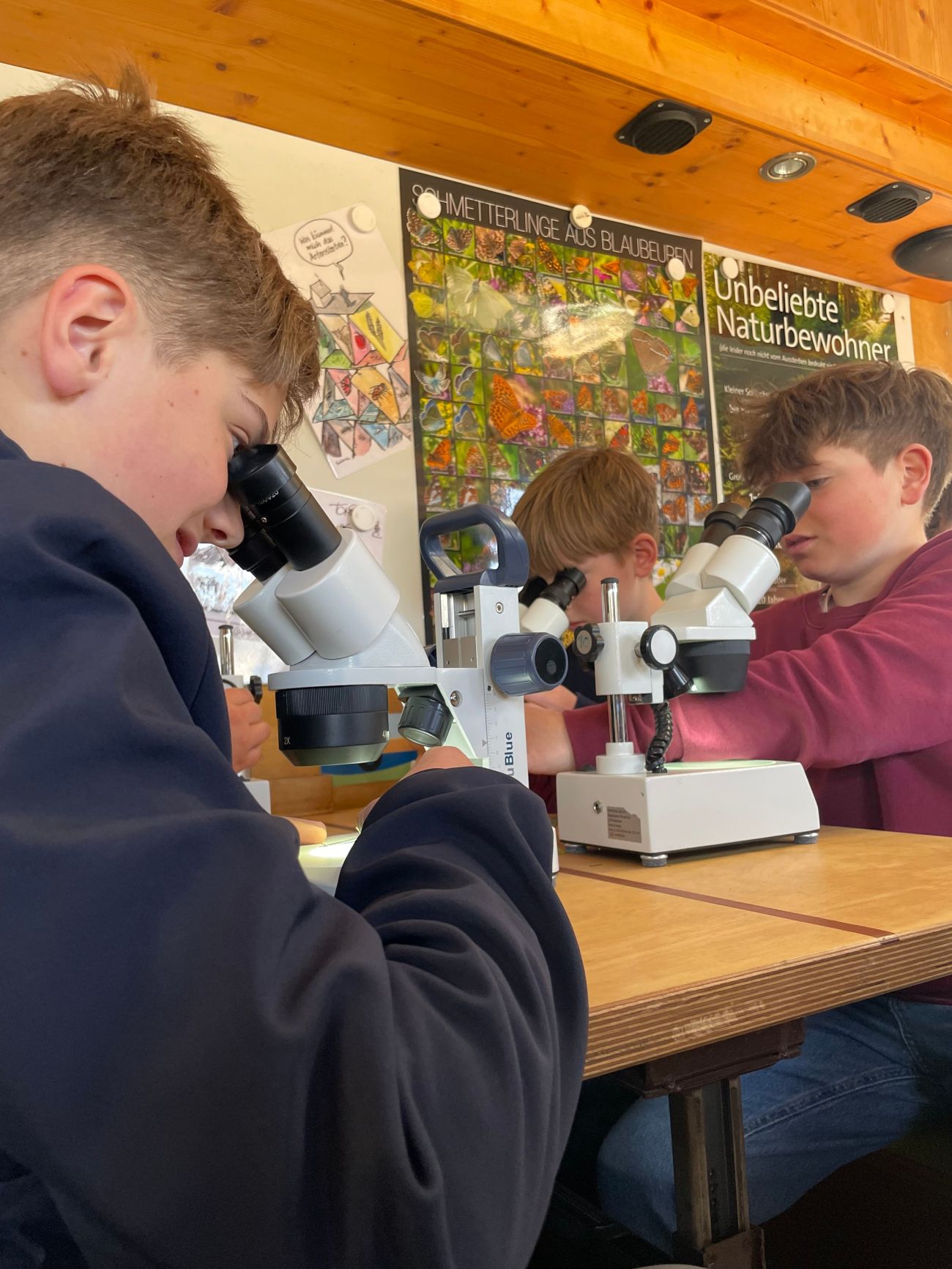 Ausgestattet mit Pinzetten, Insektengläsern, Keschern und Bestimmungsbüchern machten sich die Schülerinnen und Schüler auf die Suche nach Pflanzen und Insekten in der unmittelbaren Umgebung des Schulgeländes des BSBZ. Was sie fanden, wurde anschließend im rollenden Labor genau unter die Lupe genommen – im wahrsten Sinne des Wortes. Mit Hilfe von Okularen und sogar einem Elektronenmikroskop konnten die jungen Forscherinnen und Forscher ihre Funde bestimmen und Details entdecken, die dem bloßen Auge verborgen bleiben.