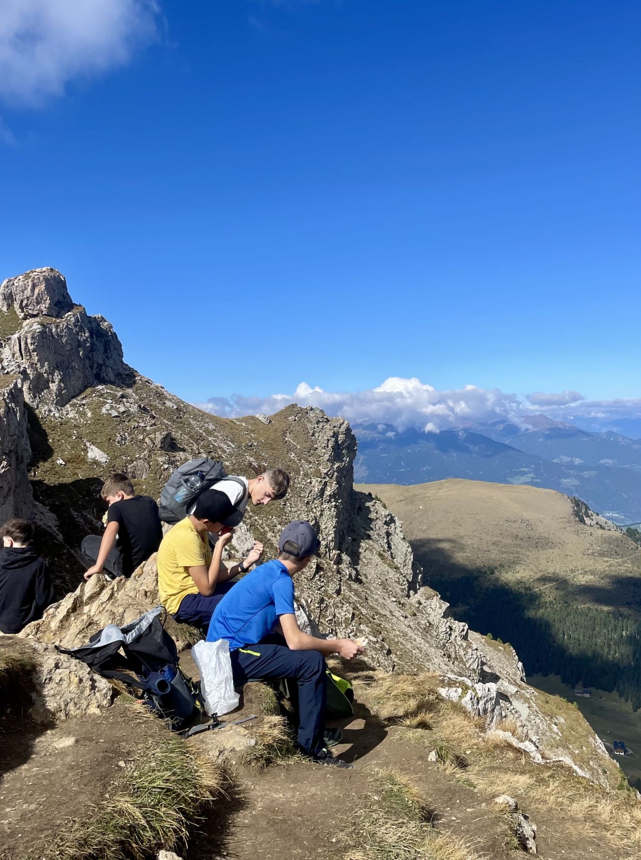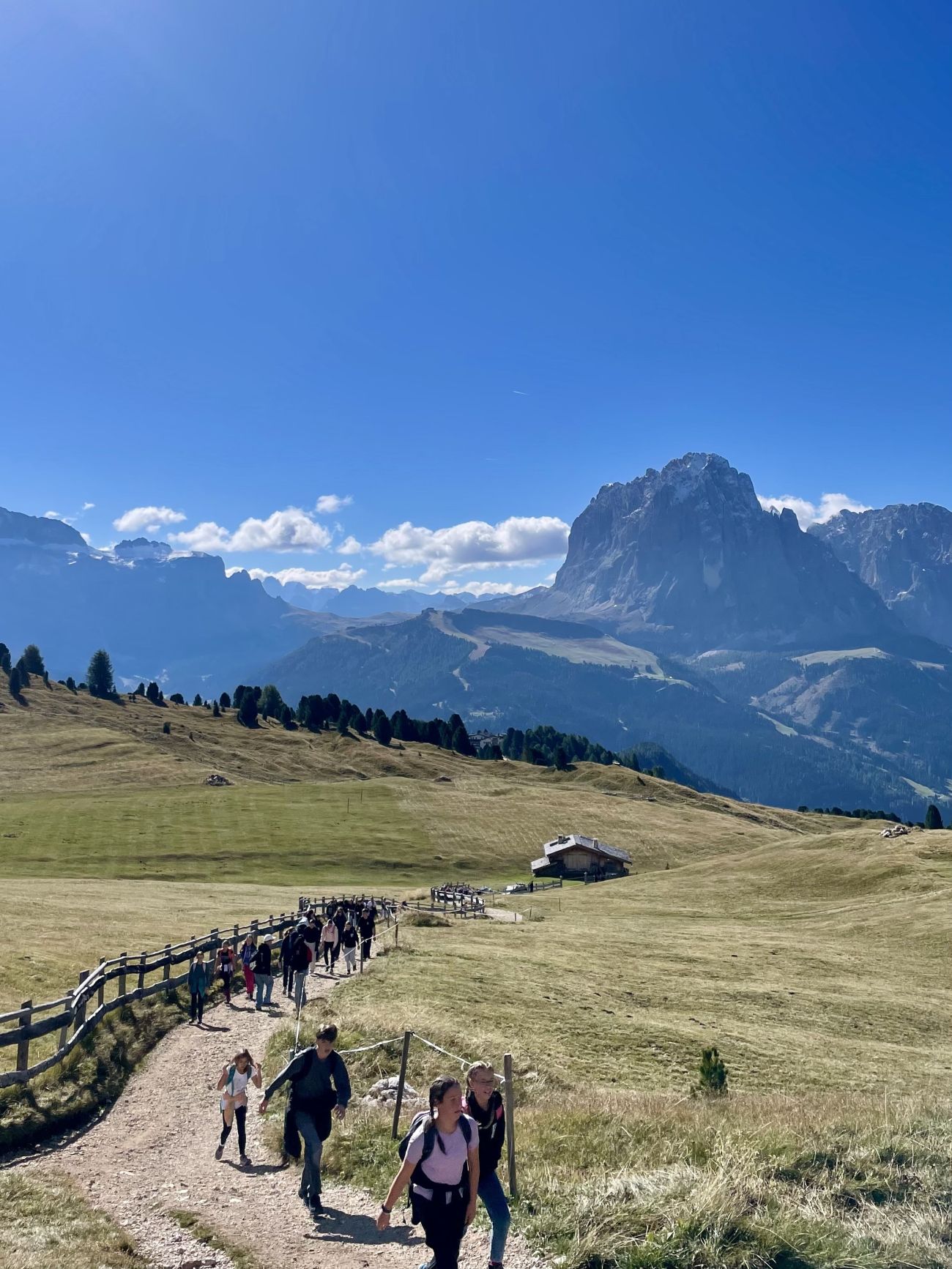 Am nächsten Morgen sind wir früh losgefahren und haben eine große Wanderung gemacht. Wir sind bis auf über 2500 m Höhe auf die Seceda gewandert, von wo wir eine wunderschöne Aussicht hatten. Hier konnten wir uns auf einer Hütte mit einem Schnitzel belohnen, bevor wir wieder nach unten gewandert sind. Am Abend haben wir Spiele gespielt, waren im Pool und auf dem Bolzplatz.