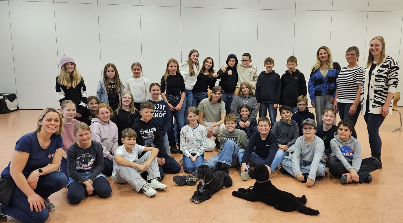 Therapiehund Gofree und den Autismus-Assistenzhund Rolex. Gemeinsam mit Frau Sziklai vom DRK Kreisverband Ulm e.V. sowie zwei DRK-Helferinnen verbrachten sie einen abwechslungsreichen und lehrreichen Nachmittag mit den Schülerinnen und Schülern.