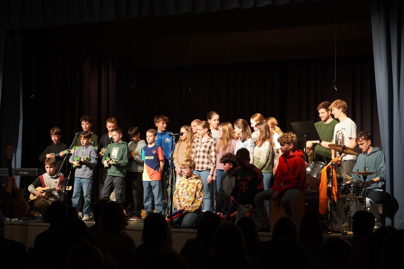 Nach kurzem Umbau entzückten die Mädchen der RS6a durch Tanzakrobatik, bevor ihre Klassenkameraden Tim und Neo das Publikum mit gewagten Reifensprüngen in Atem hielten. Richtig Stimmung im Saal herrschte beim Barbie Song und dem Lied „Wo ist meine Mama, wer hat sie gesehen“. Beide Musikstücke gestalteten die 6. Klassen der WRS mit ihren Boomwhackers gekonnt und mit hoher Konzentration. Mit verblüffenden Effekten verzauberten im Anschluss die 6. Klassen des Gymnasiums das Publikum. Inspiration für ihr Schattentheater „Der Nussknacker“ hatten sich die Schüler in den vorangegangenen Wochen im Ballett in Stuttgart geholt. Gleich danach behauptete ein Chor der RS6b in einem bekannten Song, dass die Löwen heute Nacht schlafen würden. Mucksmäuschenstill war es im Saal, als Leonie und Rebecca ihren Auftritt hatten. Begleitet von einer Gitarre bat die Sängerin in ihrem Lied alle, auf ihr Bauchgefühl zu achten. Dass Teile des Programms im Advent entstanden, zeigte das groovige Jingle Bells der RS5a, begleitet von einigen Achtklässlern. Musikalisch mit hoher Geschwindigkeit gings auch gleich weiter und zwar mit dem Bischi Abbrunzati Boys und Girls-Hit: Velocita. Die gymnasiale Oberstufe, alle an diesem Abend beim Theaterbesuch in der Stadthalle Biberach, schickte per Video ihren Song Barbar‘ Ann, einen Beach Boys Klassiker, in den Saal. Um Zusammenhalt ging es im Lied „Stand by me“, den die RS7b ausdrucksstark in einer stimmigen Choreographie umsetzte. Herzerwärmend und am Flügel begleitet intonierte die 7b des Gymnasiums den Titelsong „Vois sur ton chemin“ aus dem französischen Film „Die Kinder des Monsieur Mathieu“.