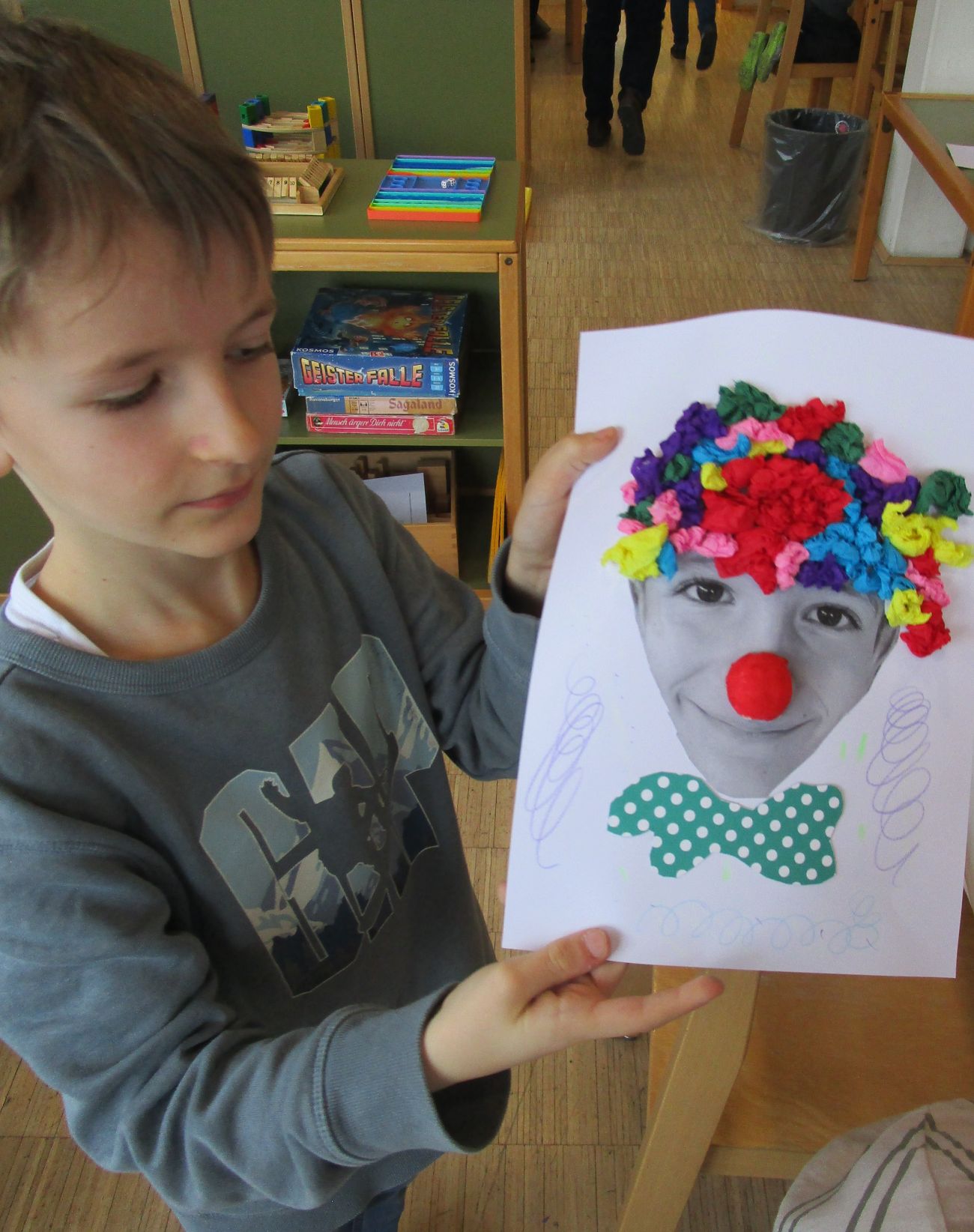 Dann ging es endlich los. Gesichter aufkleben, Frisur entwerfen, „Bobbels“ befestigen und den Clown fertig stellen. Jetzt kann die Fasnet starten.