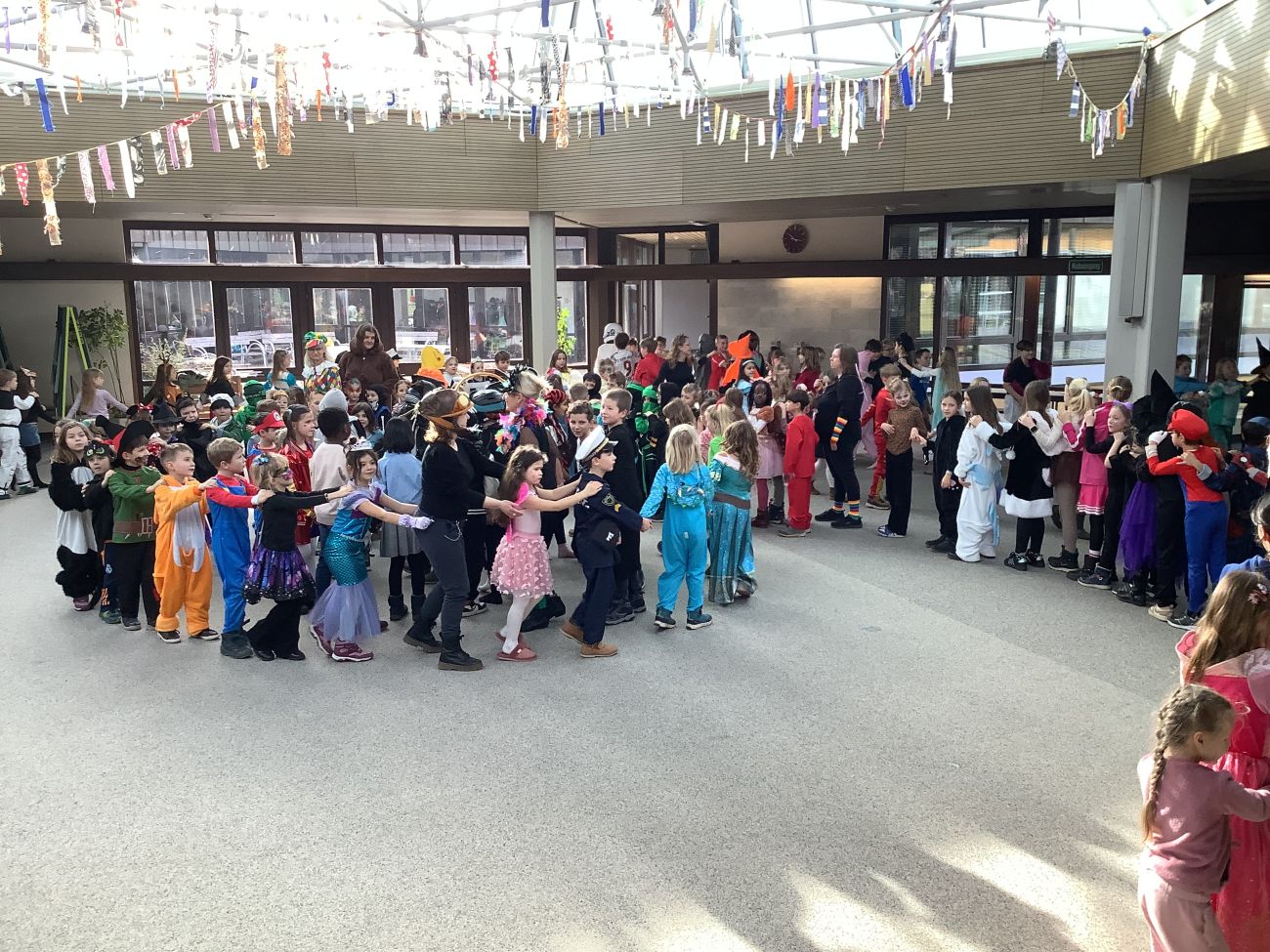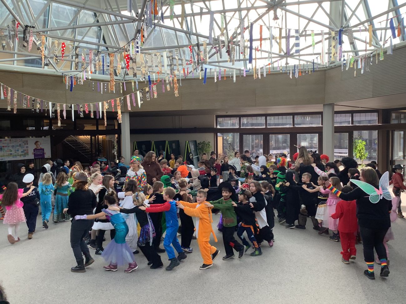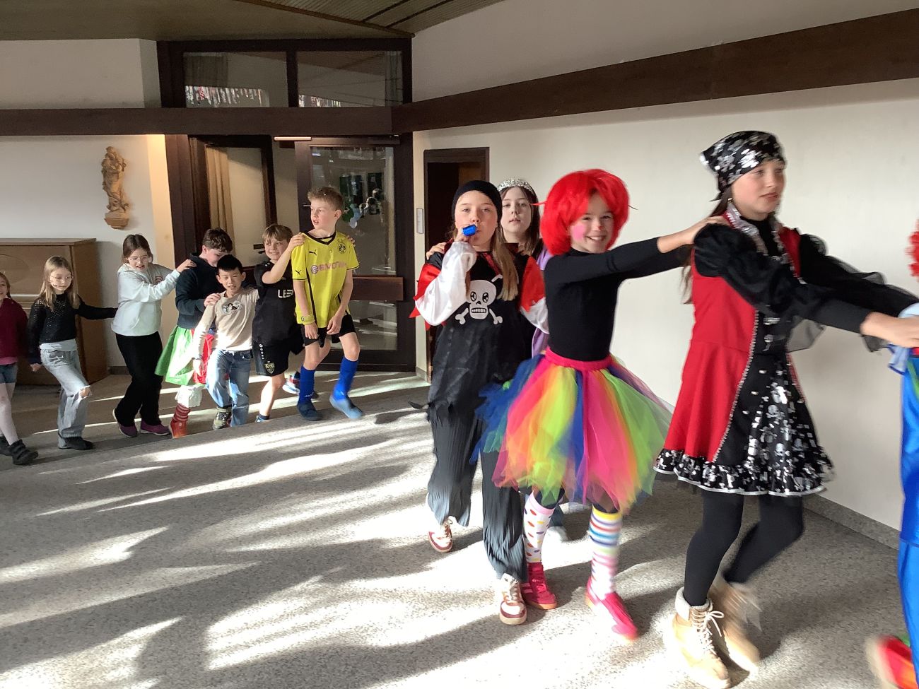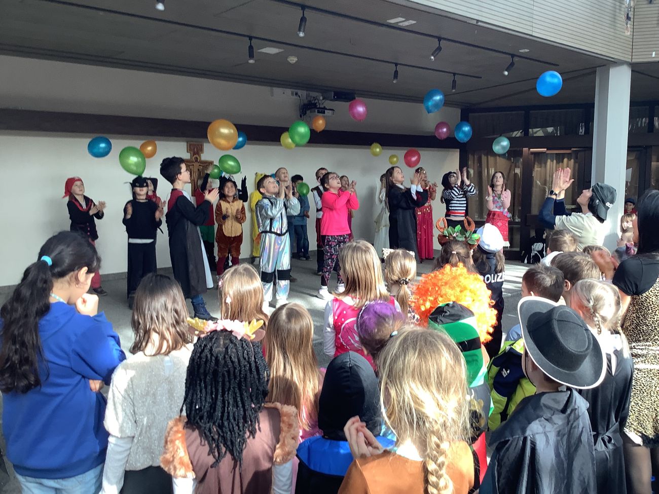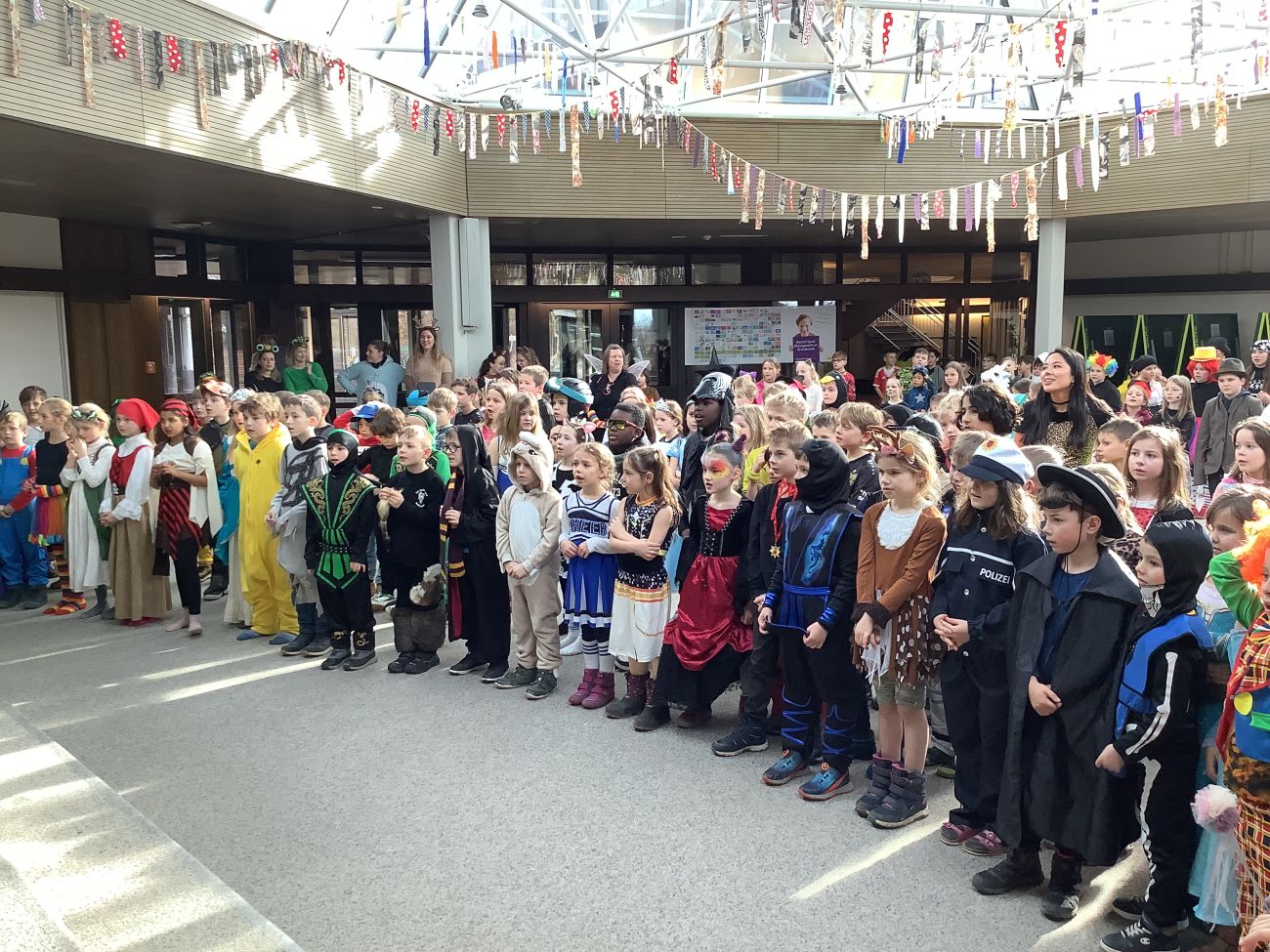 Traditionell wurden alle Grundschulklassen + die Kooperationsklasse 1 SBBZ Baindt Sehen nach der großen Pause mit einer Polonaise abgeholt. Mit fetzigen Liedern wurden sie in die alte Aula geführt. Singen, Tanzen, Akrobatik, Witze, Fasnetssprüche, Lachen, dort gab es einiges zum Bestaunen und Mitmachen. Bunt und vielfältig war das Programm, so dass die Zeit viel zu schnell verrann. Wir freuen uns schon auf´s nächste Jahr und singen laut: Hipp, Hipp, Hurra