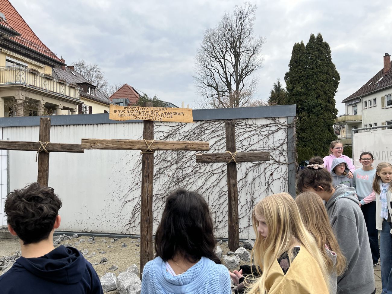 Eine besondere Exkursion führte die 6. Klassen des Gymnasiums auf eine eindrucksvolle Reise durch die Ostergeschichte. Gleich zu Beginn wurden wir von Mirijam, der „Tochter des Evangelisten Lukas“, empfangen. Mit ihr gingen wir durch ein Stadttor Jerusalems – und waren plötzlich mitten im Geschehen.