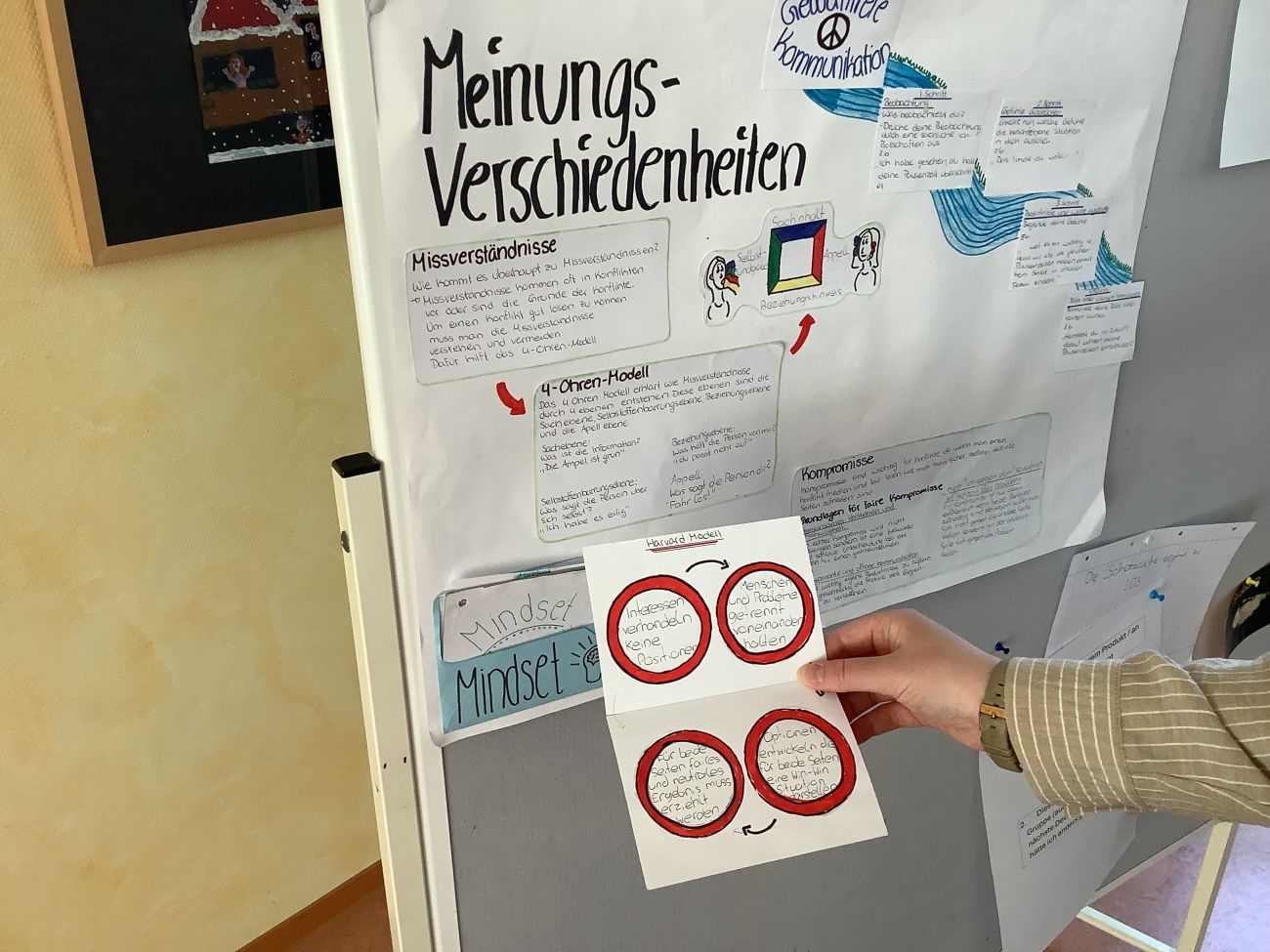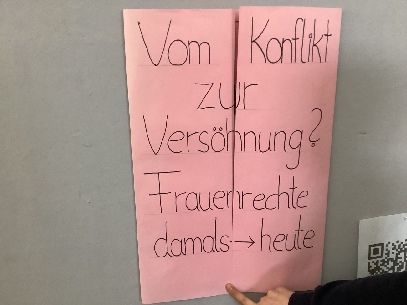 In der Osterzeit, die bis Pfingsten geht, feiert man am Palmsonntag auch Jesus als Friedenskönig. In der vergangenen Woche stellten die achten Klassen des Gymnasiums ihre Projektarbeiten zum Thema „Vom Konflikt zur Versöhnung“ vor. In einem Gallery Walk im Eingangsbereich der Schule erhielten Mitschülerinnen und Mitschülern sowie Lehrkräfte Einblick in die Ergebnisse des mehrwöchigen projektbezogenen Lernens in den Fächern des Vernetzten Unterrichts.